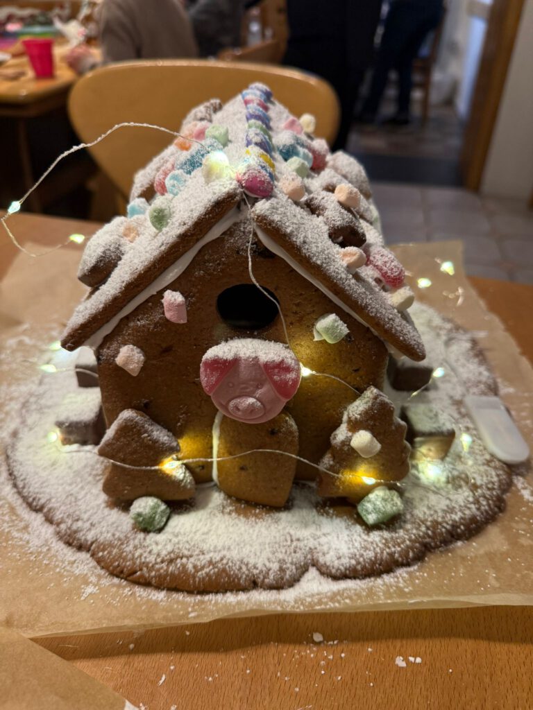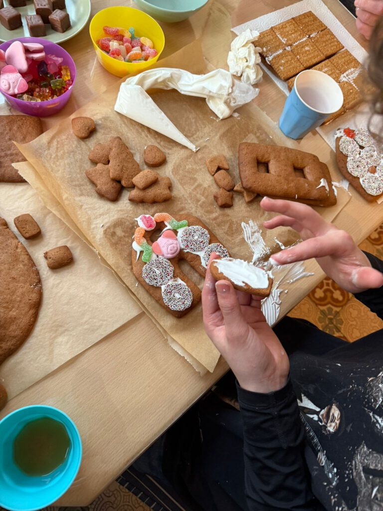 Mit viel Spaß und Kreativität entstanden bunte Lebkuchenhäuser, während im Hintergrund fröhliche Weihnachtsmusik für eine festliche Stimmung sorgte.